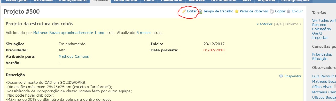 Após acessar a tarefa, haverá várias opções. Mas a que importa de início é saber editar, o que pode ser feito em qualquer opção editar que fica próximo de um símbolo de um lápis: